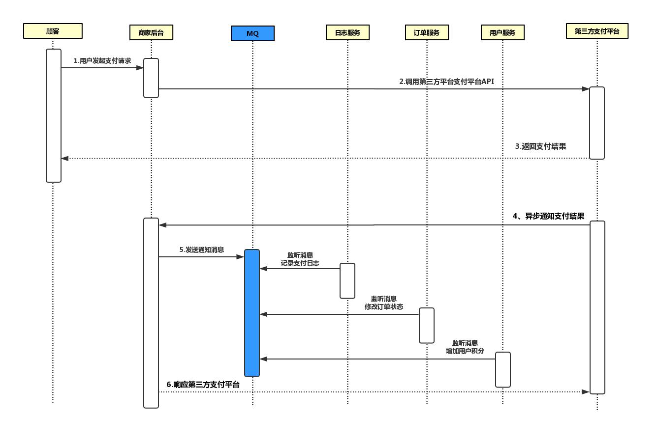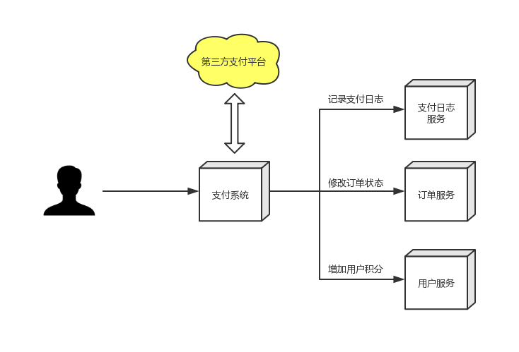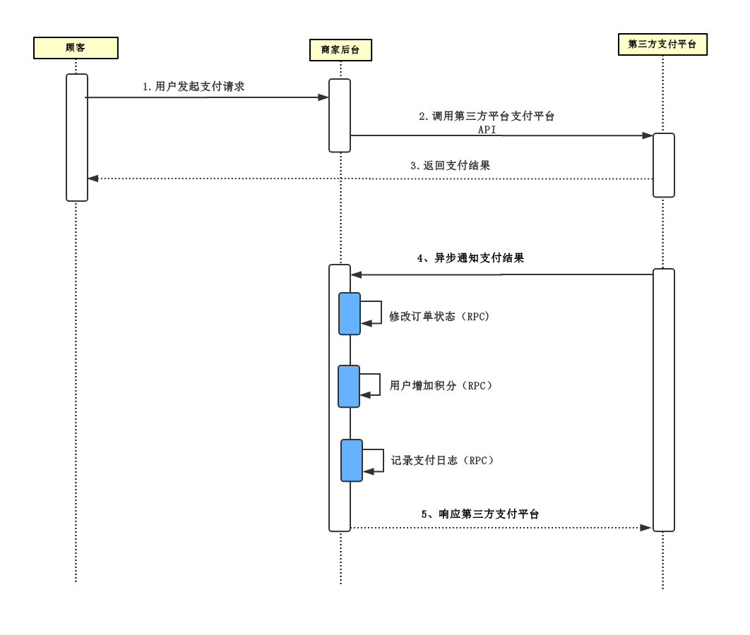用户通过第三方支付平台(支付宝、微信)支付成功后,第三方支付平台要通过回调API异步通知商家支付系统用户支付结果,支付系统根据支付结果修改订单状态、记录支付日志和给用户增加积分。