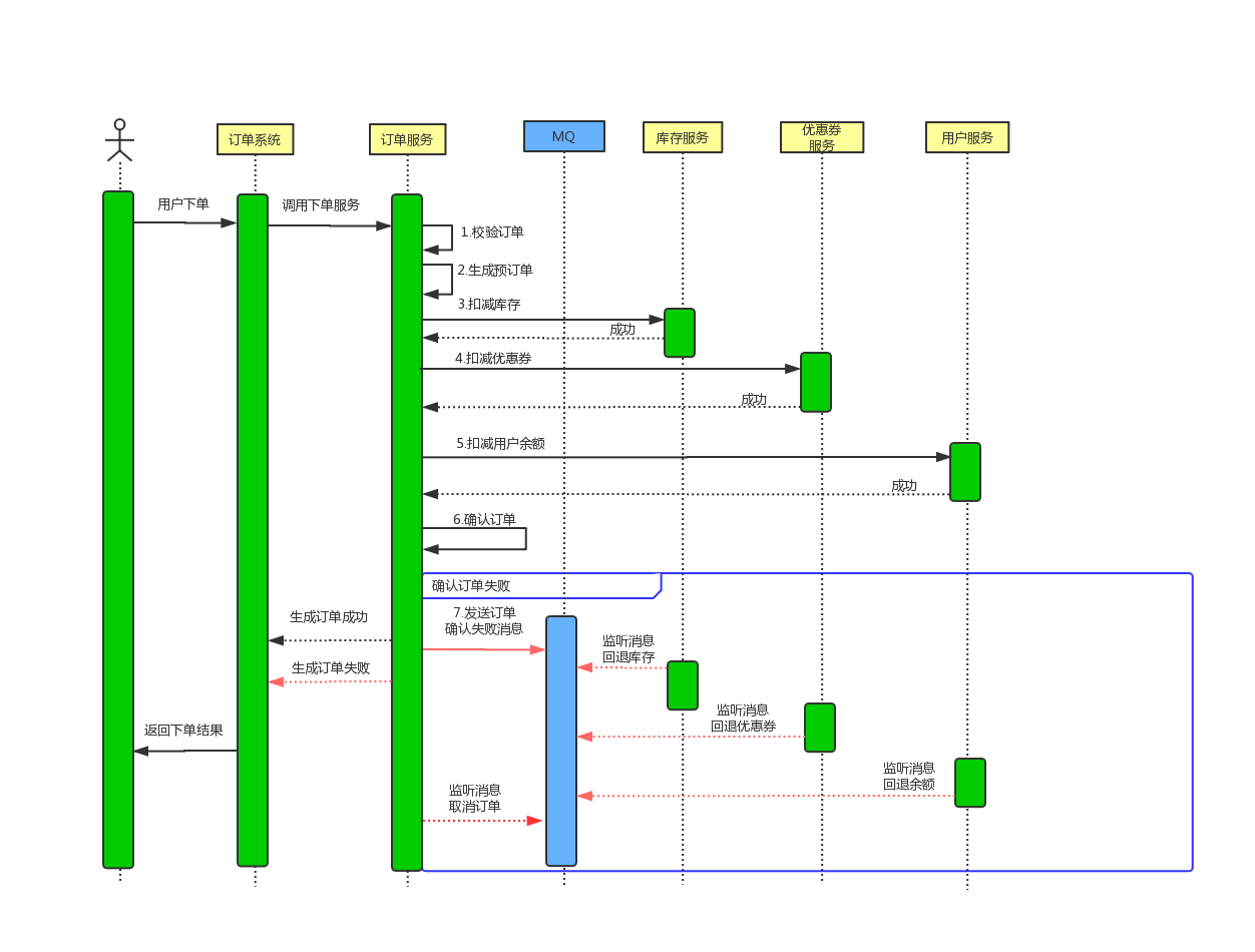 用户提交订单后,扣减库存成功、扣减优惠券成功、使用余额成功,但是在确认订单操作失败,需要对库存、库存、余额进行回退。