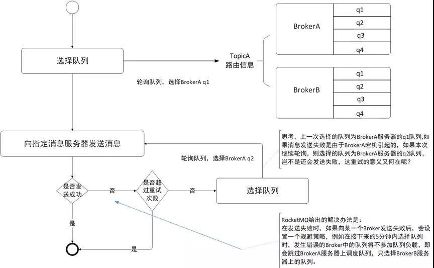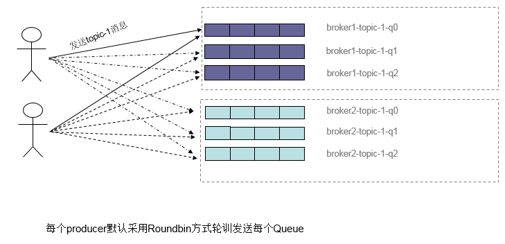 Producer端,每个实例在发消息的时候,默认会轮询所有的message queue发送,以达到让消息平均落在不同的queue上。而由于queue可以散落在不同的broker,所以消息就发送到不同的broker下,如下图: