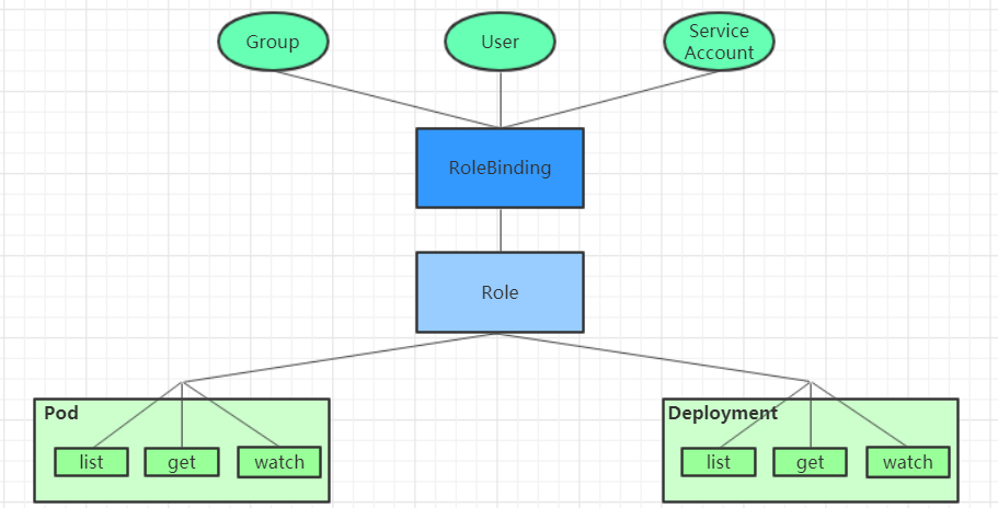 角色绑定用来把一个角色绑定到一个目标对象上,绑定目标可以是User、Group或者ServiceAccount。