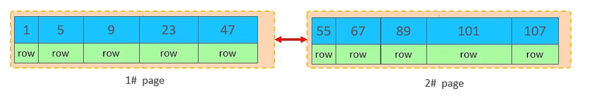 在InnoDB引擎中,数据行是记录在逻辑结构 page 页中的,而每一个页的大小是固定的,默认16K。那也就意味着, 一个页中所存储的行也是有限的,如果插入的数据行row在该页存储不小,将会存储到下一个页中,页与页之间会通过指针连接。