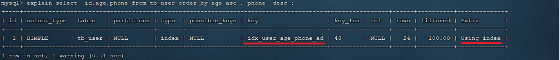 explain select id,age,phone from tb_user order by age asc , phone desc ;